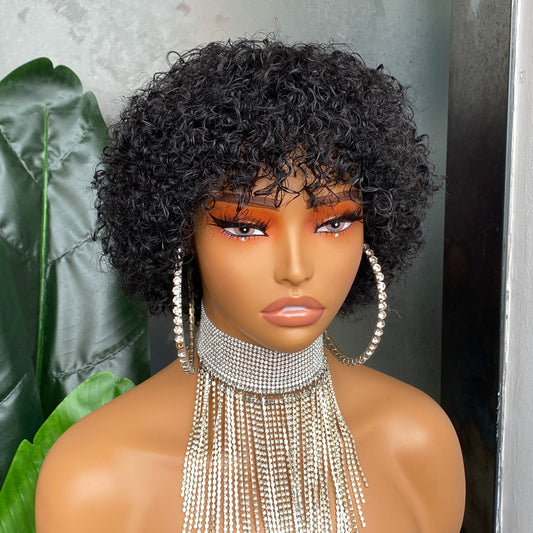 Natural Color Curly Pixie Cut None Lace Bang Wig 10 Inch