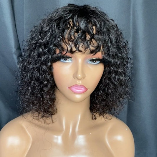 100% Remy Human HairNatural Black Pixie Curly Bang Wig 10 Inch